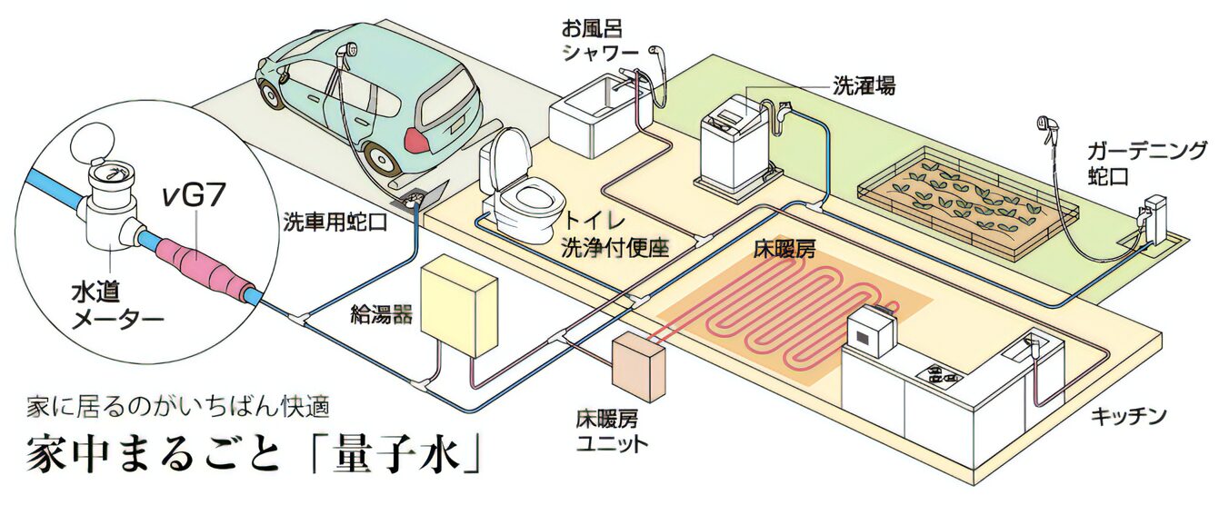 ニュージー活水器を水道管に接続するだけで家中で量子水を使うことができ、さまざまな効果が期待できます。チカラある水に蘇らせるように働くのがvG7量子水です。