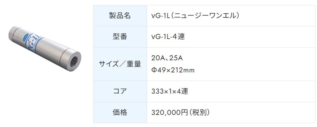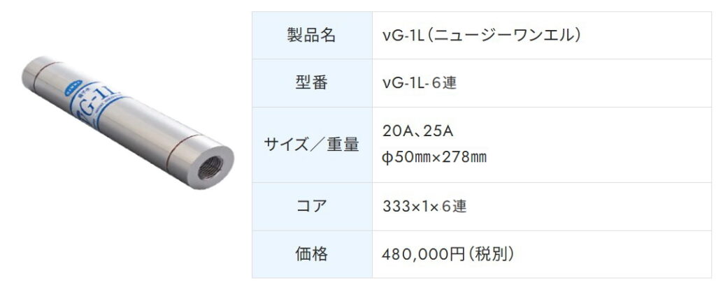 水道管元付けタイプ製品、家庭から中規模事業所様へのスタンダード製品、νG-1L(ニュージーワンエル)です。オールステンレス製で耐久性に優れ、ほぼ永年使用可能。