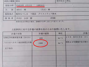 BOD:4900(基準値600未満)ノルマルヘキサン値:1600(基準値30以下)