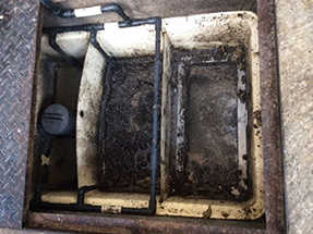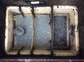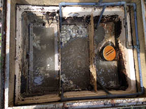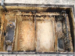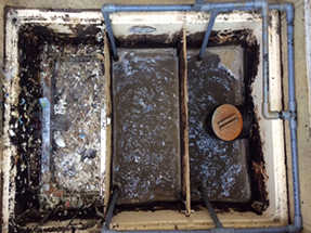 写真1は平成28年1月13日ニュージーセブンを導入する前の排水溝(グリストラップ)の様子。油とカビのような汚れで毎日清掃しなければならないひどい状態であった。