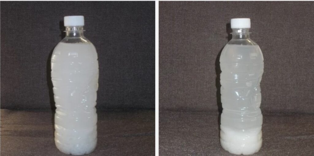 ちなみに、量子水のお米は3年どころか、15年目の現在も腐っていないとのこと。その後は、腐りやすい牛乳を使った実験をしています。500cc入り牛乳パックを3つ用意。18000回のリバース水に5時間浸漬したもの、24連のvG7を元栓につけた水道水に5時間浸漬したもの、3何もしないままの3つを、各1·5メートル離して軒先に吊るしておきました。