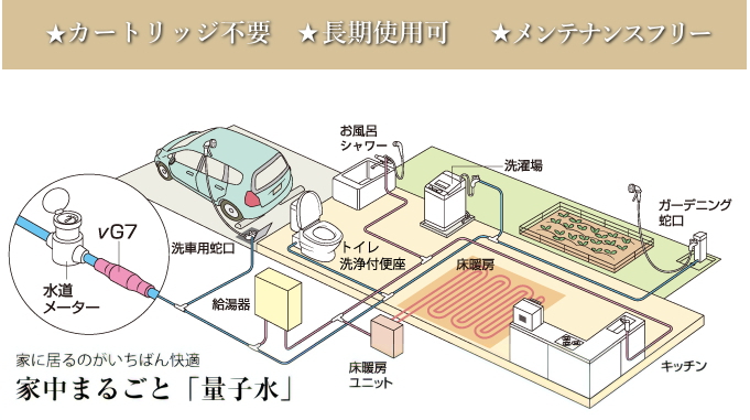 私たち人間は呼吸や肌からも水を吸収します。飲み水はもちろん、シャワー、お風呂、洗濯水、庭先など生活に必要な水すべてをエネルギーに満ちた水に変えることも、健康維持に欠かせません。νG7活水装置を水道の元に取付けることで、家中の水が塩素の害がない、健康維持と病気の改善に有効な活力を持った水になります。